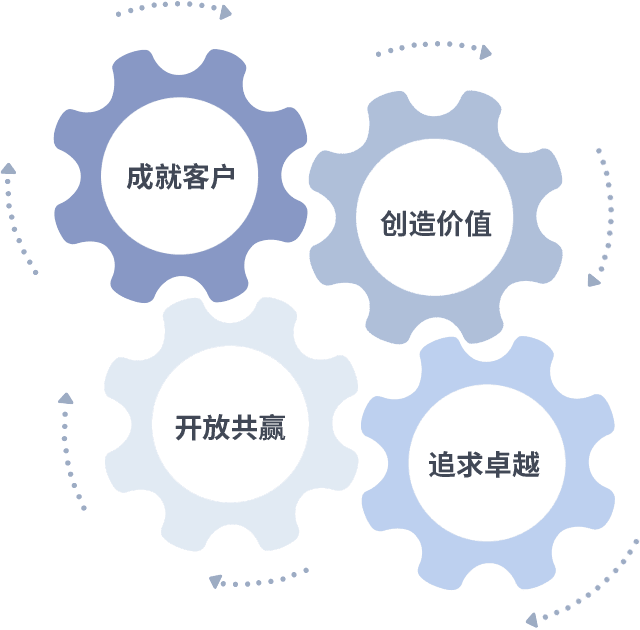 成就客户是一切决策的出发点,,,,创造价值是衡量所有工作的标准,,,追求卓越是我们做事做人的态度,,开放共赢是我们的格局也是最终的结果。。。。价值观的齿轮环环相扣,,,推动着组织里的每个人不断向前。。。。